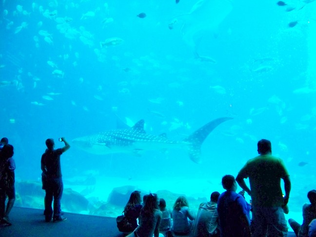 | We then went across the way to the Georgia Aquarium which was way pricey ($30 by itself). They did a great job of setting things up for impressive views and pictures. I made a video of the fish and a jellyfish. I wonder if the lighting was set up for bright colors (using UV and such). |