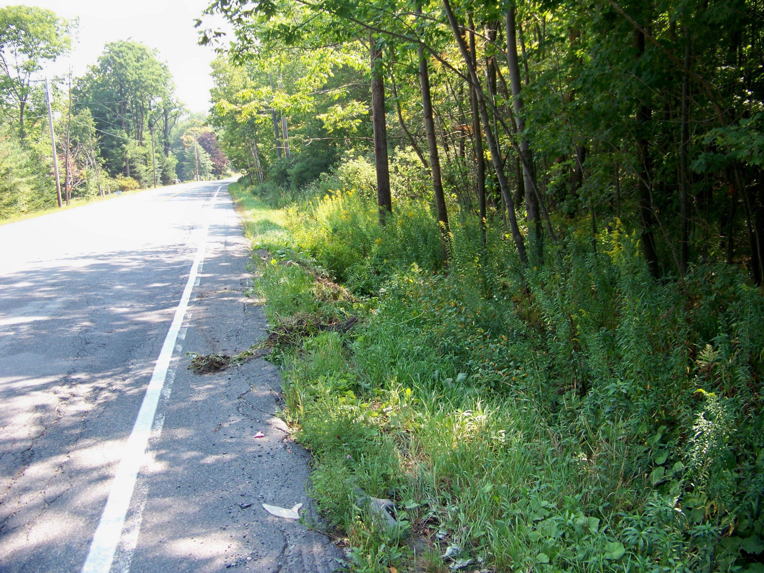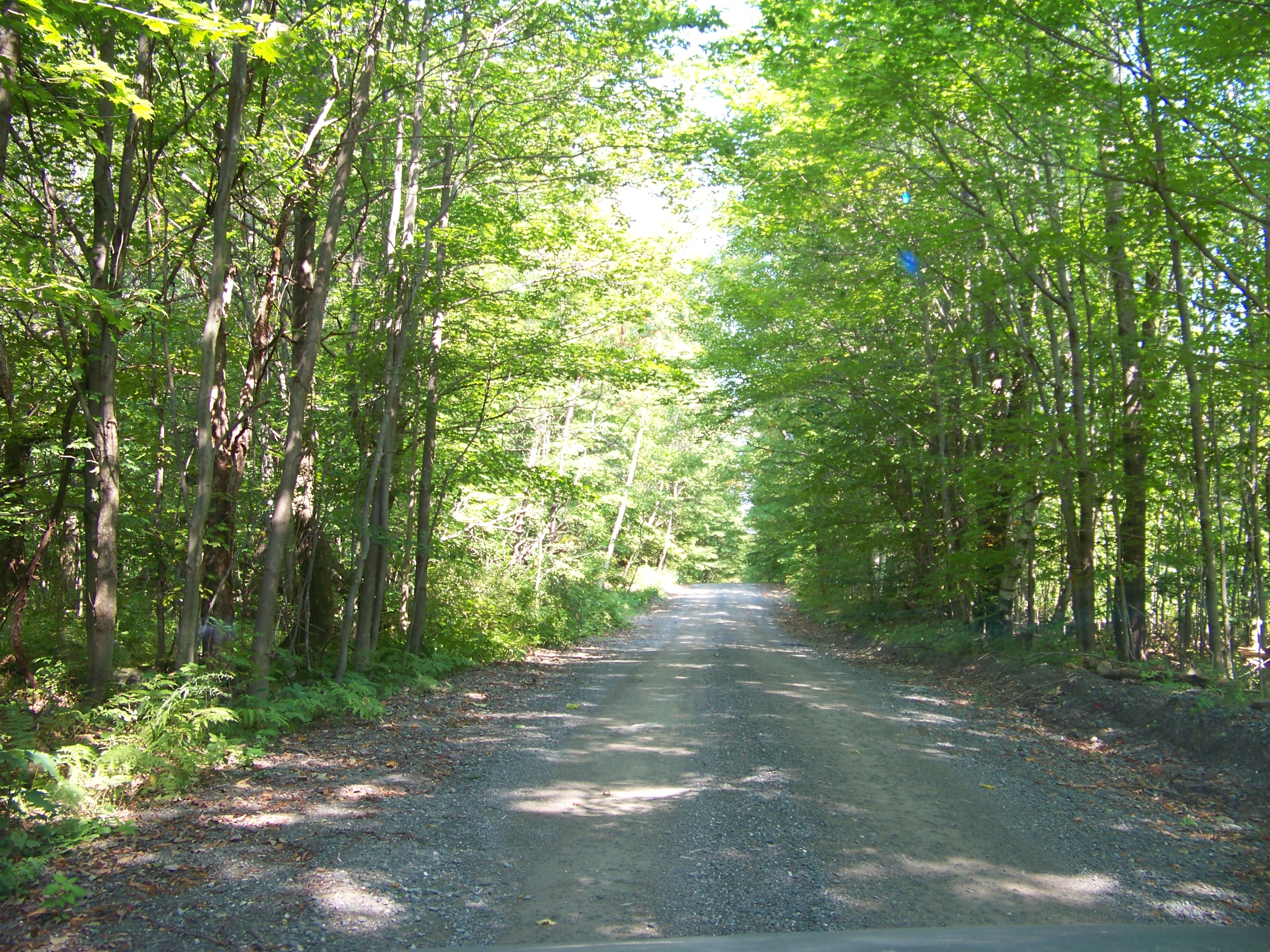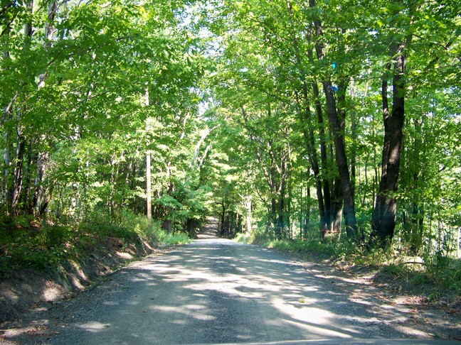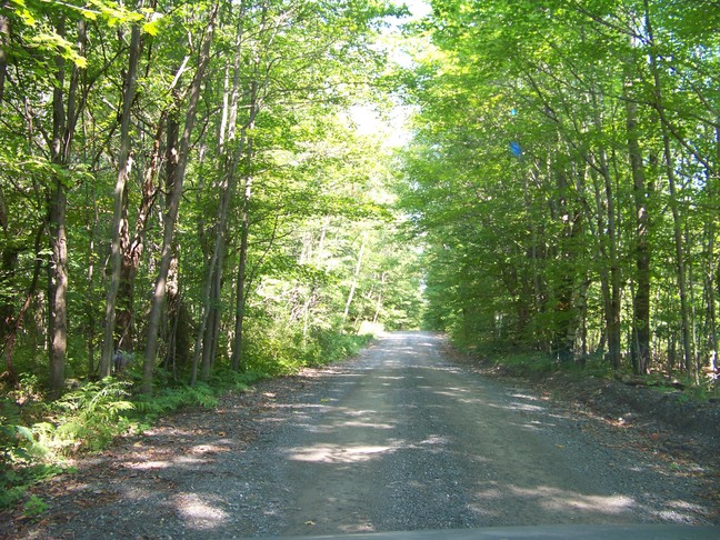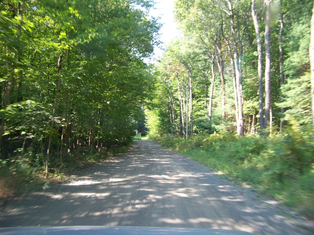 | In September Jay got serious about getting his driver's license. We started taking trips around the area so that he could practice his driving. On one trip we were headed to the Grafton Peace Pagoda. I was using my GPS and told Jay to take the next right (shown above), but he did not think I meant that little road (shown above) and tried to slow down and make the turn at the last moment. We didn't make it, but got stuck in the culvert. It was surprisingly steep / deep. Yikes! However, about three cars stop and the farmer from the house just across the street came out. He was able to pull us out with his traffic and there were no damages. It was also a good lesson about avoiding going off on the shoulder.... The road to the Peace Pagoda was a pretty unpaved road. |